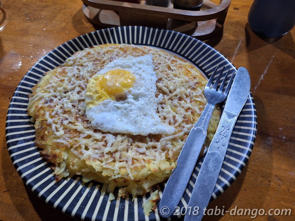 夕食はオーナーおすすめのスイスロスティ(ポテトのお好み焼きみたいなもの)。ボリュームたっぷりでおいしかったです。
