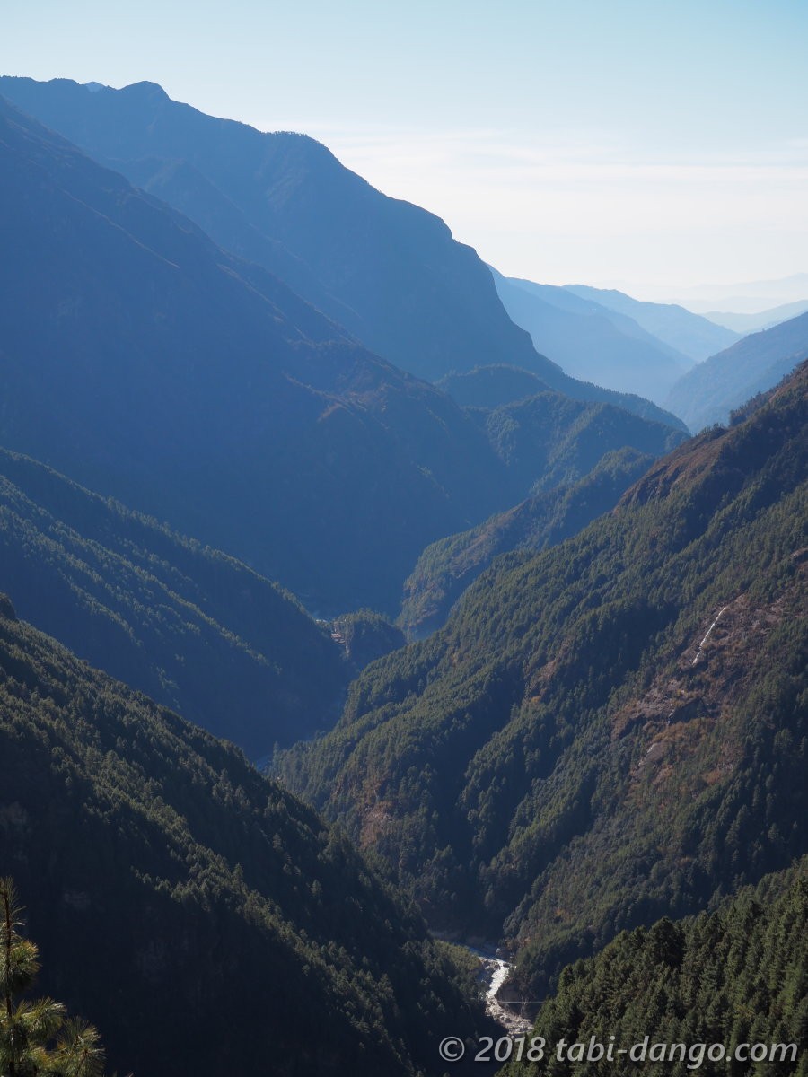 振り返ると、遥か下に白いドゥードコシの流れがあり、ジョーサレの集落や吊り橋も見えました。そしてさらに遠くの山腹には、5日前に泊まったタマダンダのロッジの建物がピカピカ光っているのが見えました。あんなに遠くから山越え谷越え、よくここまで歩いてきたもんだ!