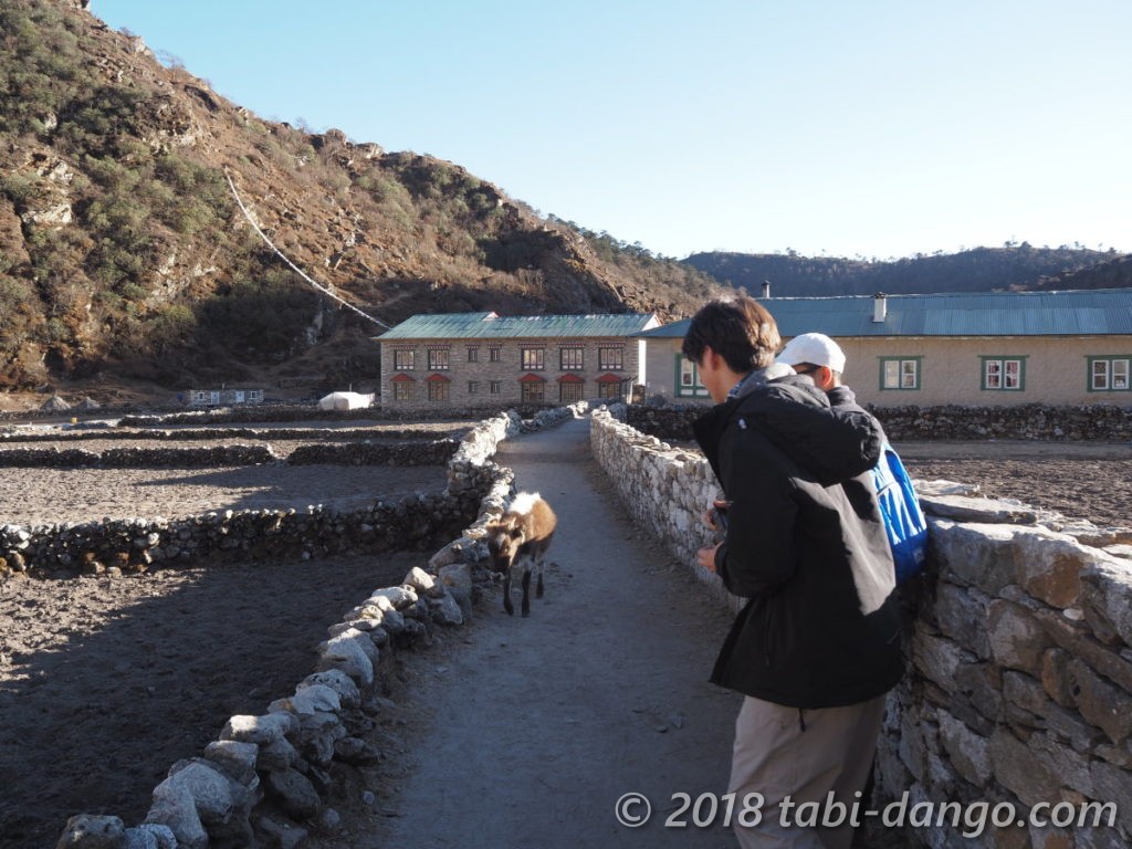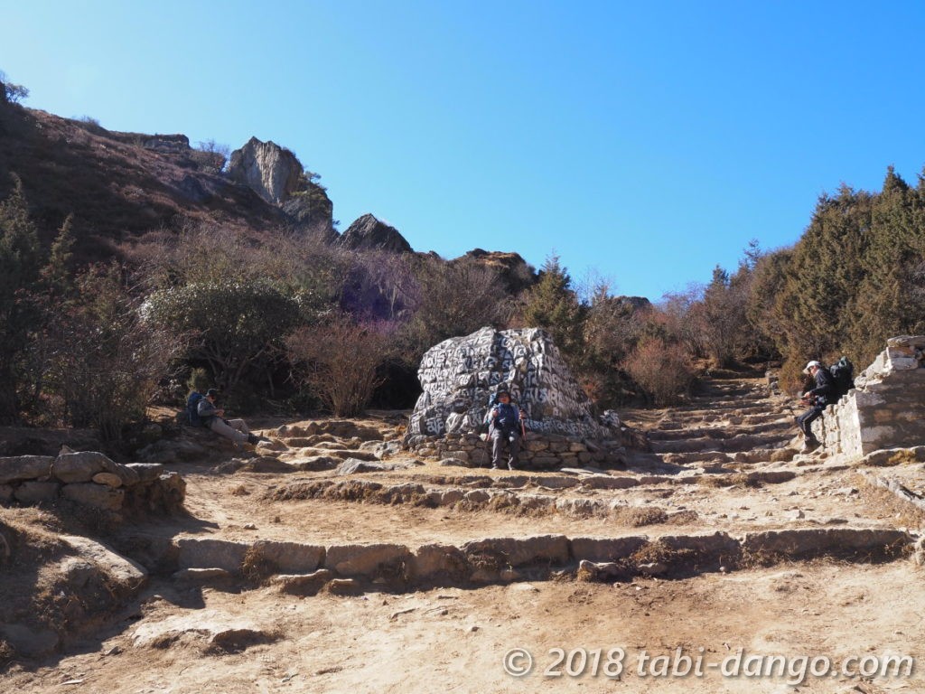 クムジュンへはナムチェへ戻るような向きで坂を上っていきました。ナムチェで2泊して高度順応できたと思っていたのに上り坂は全然楽になりません。40分ほど歩いてようやく村の端に着きました。