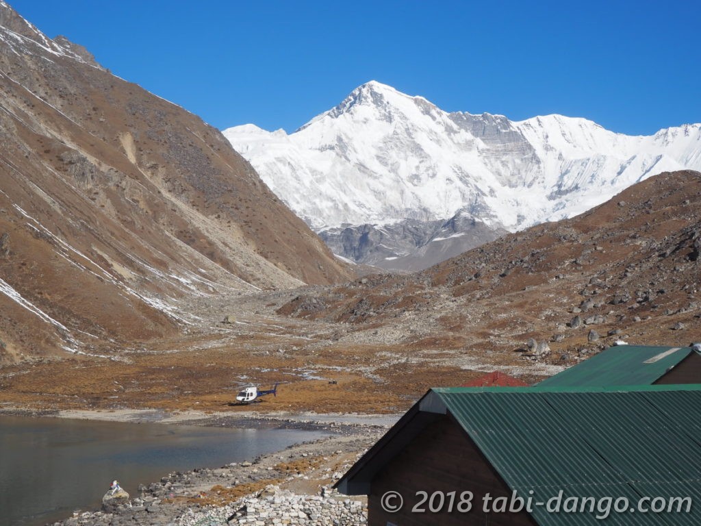 それからしばらくして、静かな村に大きな音でヘリコプターがやってきました。湖の上をぐるりと周って飛んできて、チョーオユーをバックに着陸。格好いい!