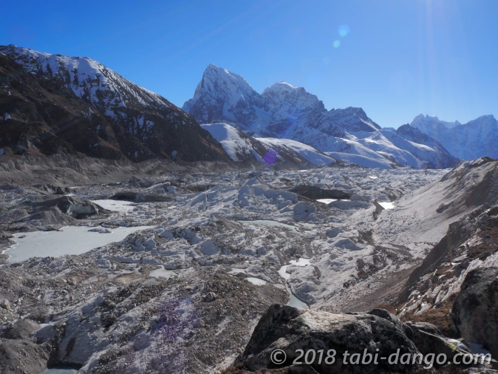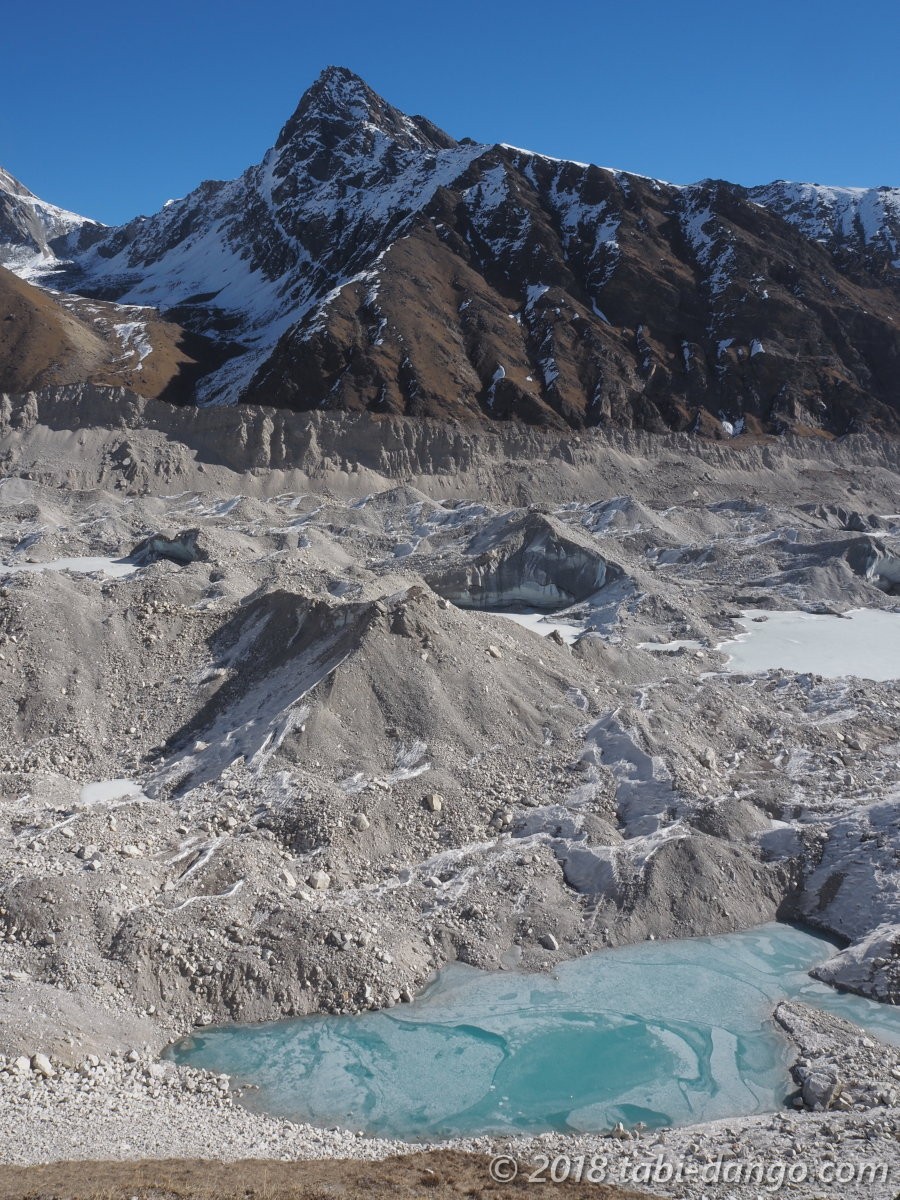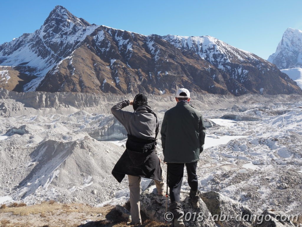 氷河には土砂の山がずっと広がっていて、まるで巨大な工事現場のよう。チョーラという峠に向かうルートもどこかにあるはずなのですが、どこをどう歩くのか全く想像がつきませんでした。
