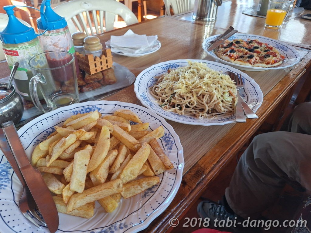 散歩のあとはロッジに戻り、ピザ、フライドヌードルとフライドポテトをランチに食べました。