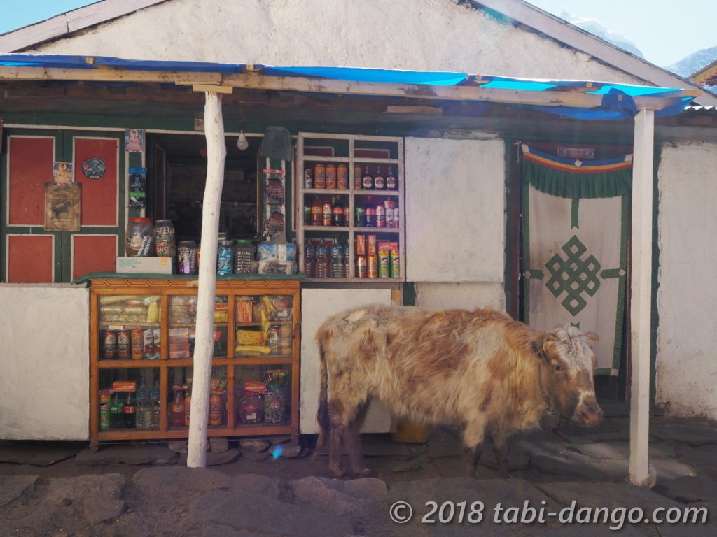 ゴンパの隣の商店の前には、看板娘(?)の牛が1匹。