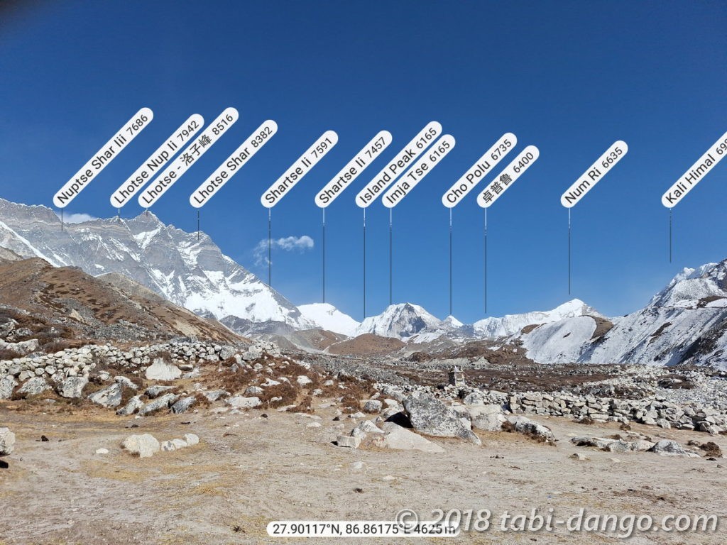 正面にはアイランドピーク(6165m)。その左の真っ白な山はシャルツェ(7457m)。そしてローツェ(8516m)。