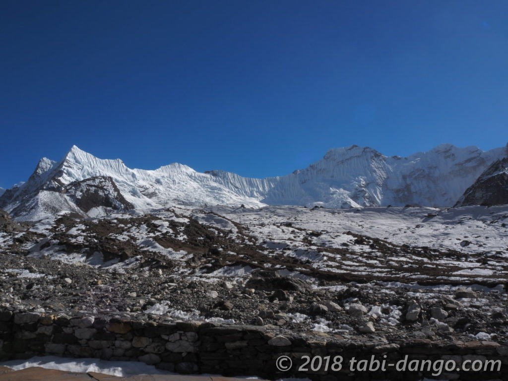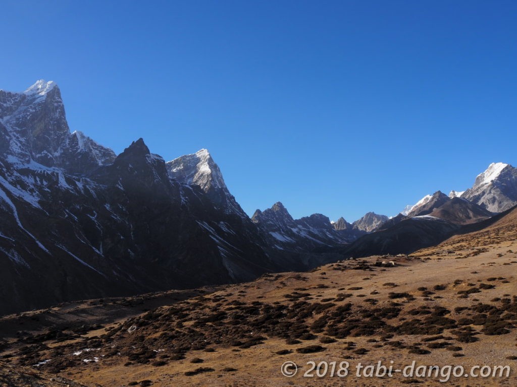 この山々の左側がゴーキョへのルートです。一番奥にはチョーオユーがちらりと見えていました。