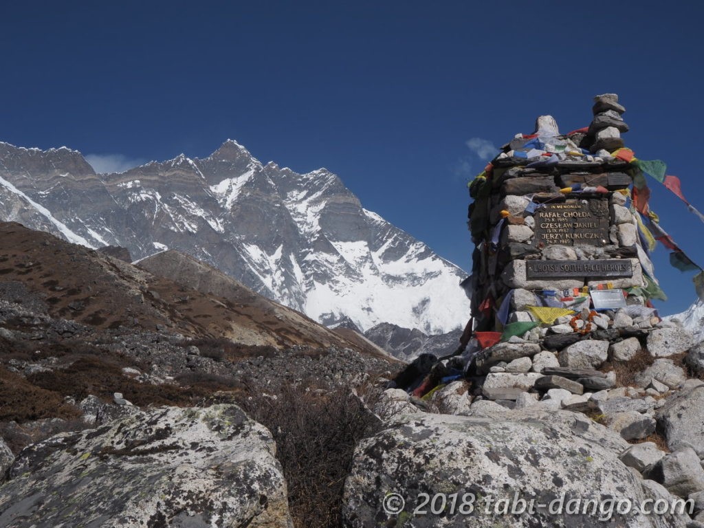 ローツェがきれいに見える場所に、ローツェ南壁で亡くなった登山家たちの記念碑がありました。イェジ・ククチカなどとても有名な人たちのようです。
