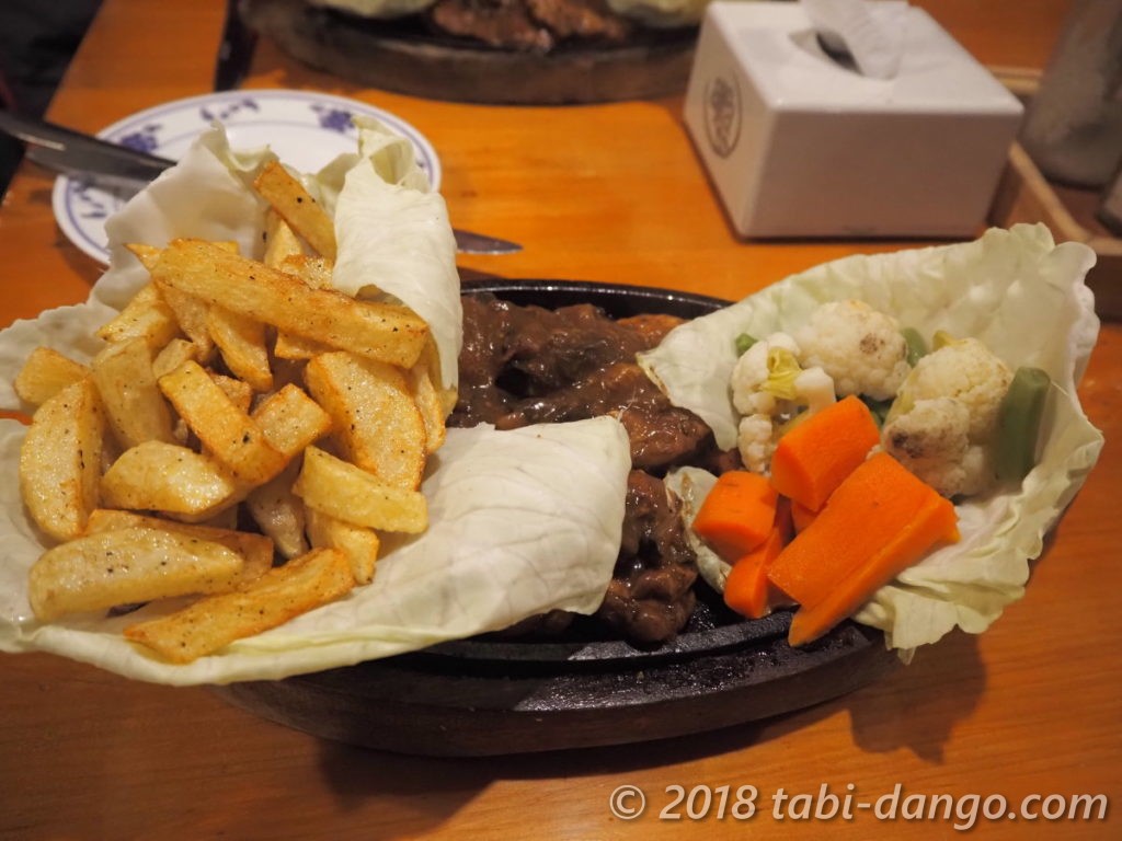 このロッジのオーナー一家も数日前にカトマンズに行ってしまい、スタッフの男性が調理してくれました。そのおかげか鶏肉の量が前回の2倍にボリュームアップ!付け合わせも鉄板からはみ出る勢いでした。