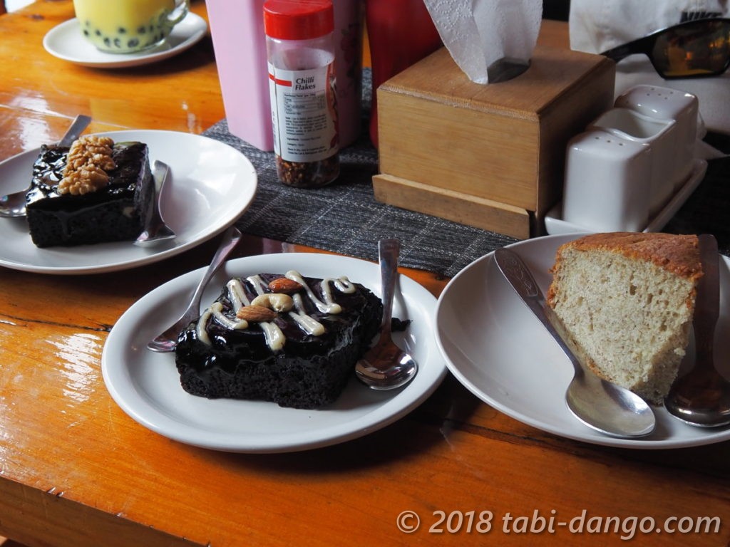 バナナケーキはフワフワ、ブラウニーは半分とろけるような食感で、このトレッキングで食べたケーキの中で一番おいしかったです。子供たちはバブルティーも頼んでいました。